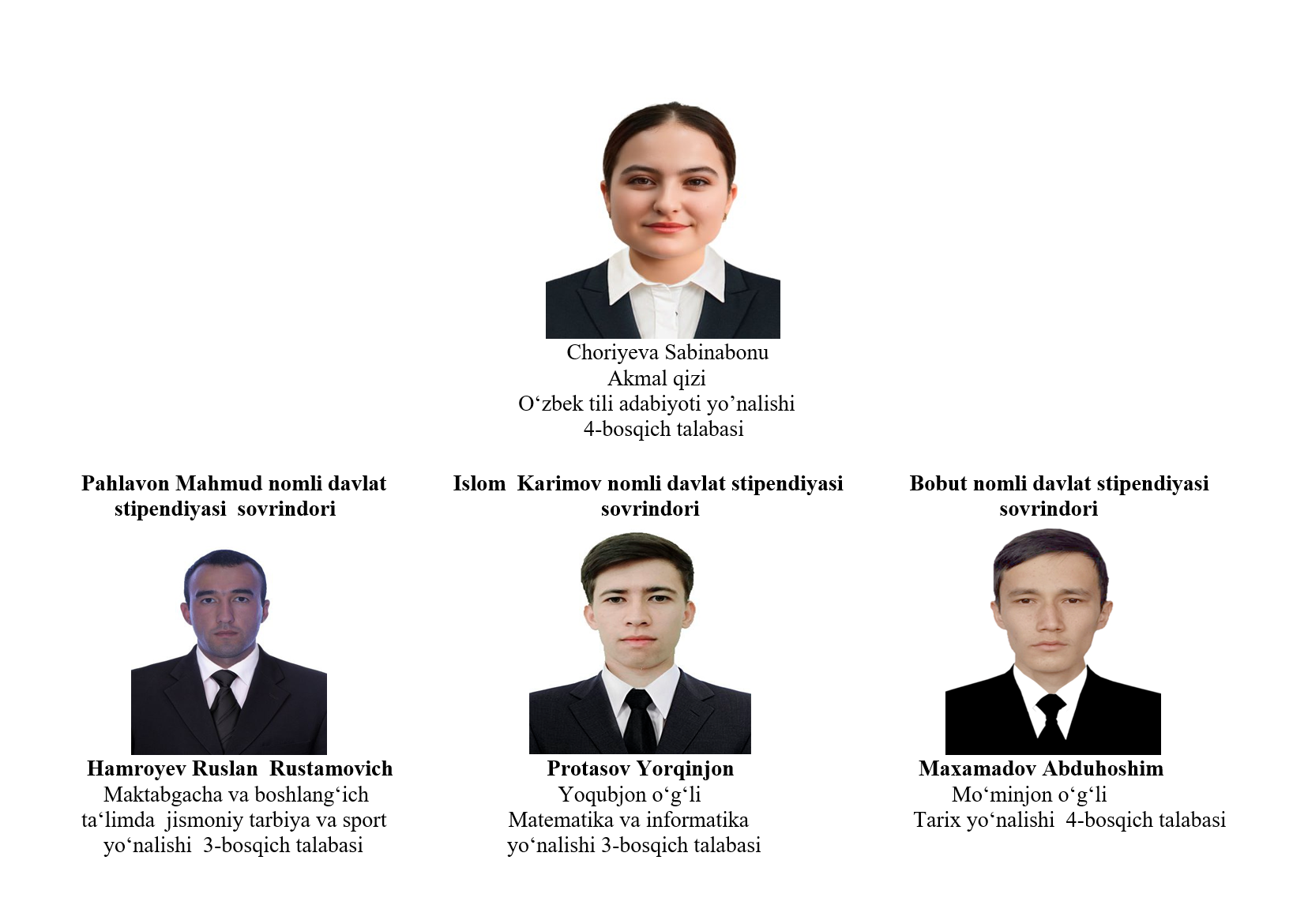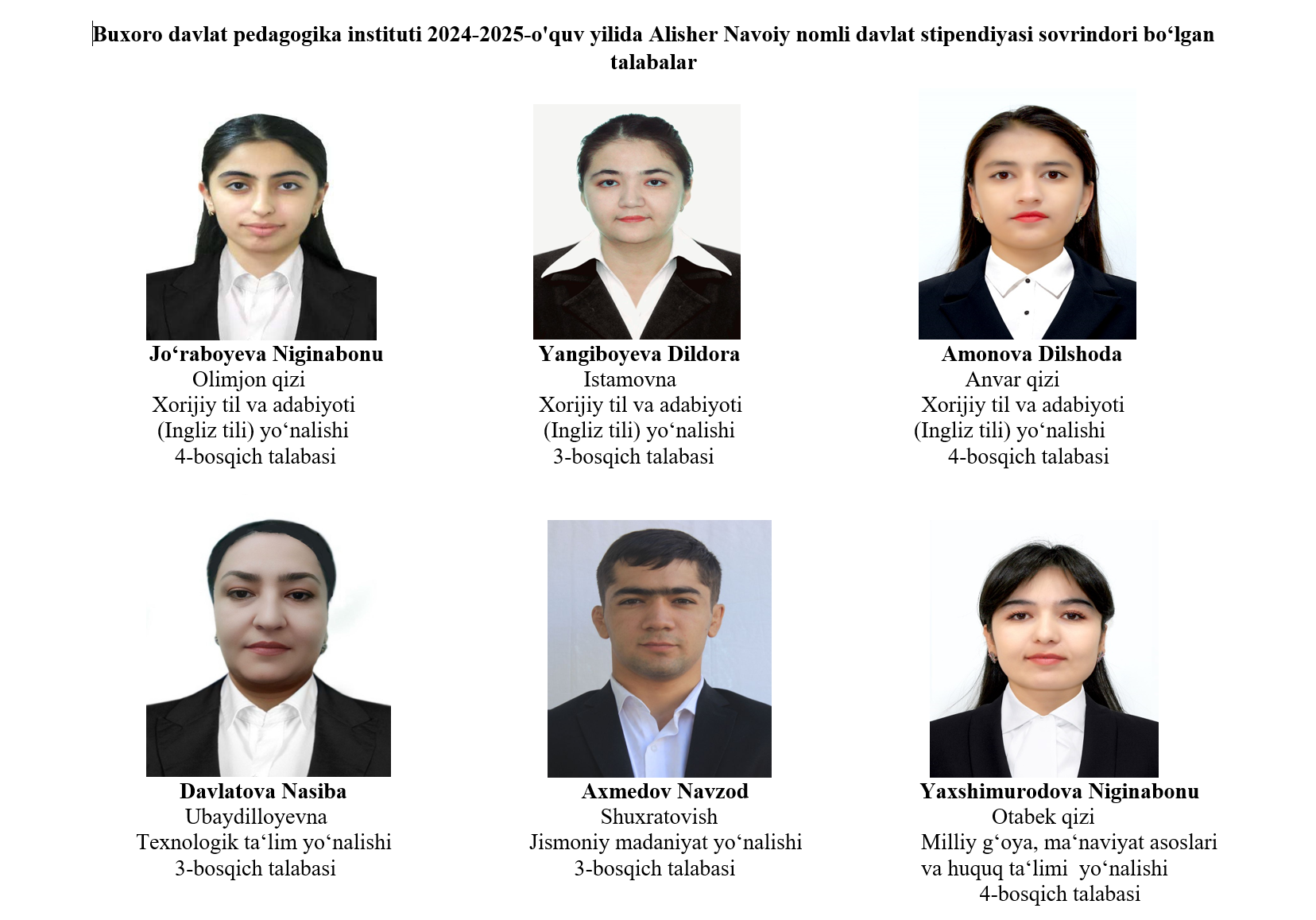 7-Amonova Dilshoda Anvar qizi- Xorijiy til va adabiyoti Ingliz tili yo‘nalishi 4-bosqich talabasi 8-Davlatova Nasiba Ubaydilloyevna-Texnologik ta‘lim yo‘nalishi 3-bosqich talabasi 9- Axmedov Navzod Shuxratovish- Jismoniy madaniyat yo‘nalishi 3-bosqich talabasi 10-Yaxshimurodova Niginabonu Otabek qizi- Milliy g‘oya, ma‘naviyat asoslari va huquq ta‘limi yo‘nalishi 4-bosqich talabasi