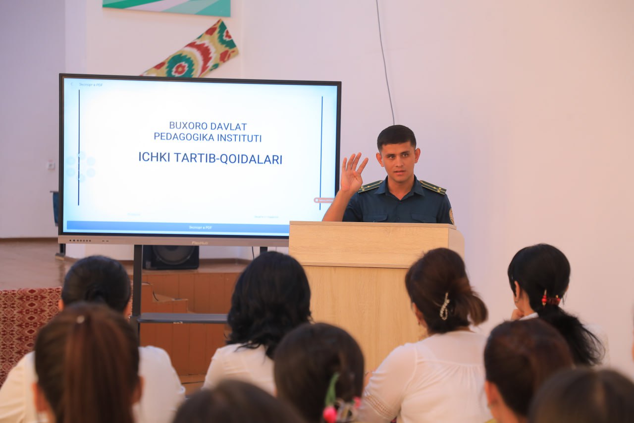 Buxoro davlat pedagogika institutida 1-kurs talabalari uchun institut ichki tartib-qoidalari bo‘yicha tanishtiruv tadbiri o‘tkazilmoqda. Unda talabalarga darslarga qatnashish, kiyinish madaniyati, ta’lim muassasasi hududida o‘zini tutish qoidalari hamda intizomiy talablar batafsil tushuntirildi.